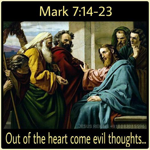 14 And he called the people to him again, and said to them, "Hear me, all of you, and understand: 15 there is nothing outside a man which by going into him can defile him; but the things which come out of a man are what defile him." 17 And when he had entered the house, and left the people, his disciples asked him about the parable. 18 And he said to them, "Then are you also without understanding? Do you not see that whatever goes into a man from outside cannot defile him, 19 since it enters, not his heart but his stomach, and so passes on?" (Thus he declared all foods clean.) 20 And he said, "What comes out of a man is what defiles a man. 21 For from within, out of the heart of man, come evil thoughts, fornication, theft, murder, adultery, 22 coveting, wickedness, deceit, licentiousness, envy, slander, pride, foolishness. 23 All these evil things come from within, and they defile a man."