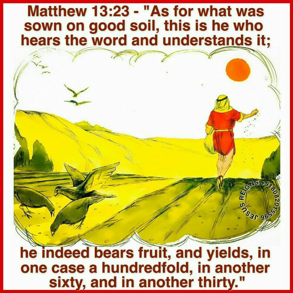 18 "Hear then the parable of the sower. 19 When any one hears the word of the kingdom and does not understand it, the evil one comes and snatches away what is sown in his heart; this is what was sown along the path. 20 As for what was sown on rocky ground, this is he who hears the word and immediately receives it with joy; 21 yet he has no root in himself, but endures for a while, and when tribulation or persecution arises on account of the word, immediately he falls away. 22 As for what was sown among thorns, this is he who hears the word, but the cares of the world and the delight in riches choke the word, and it proves unfruitful. 23 As for what was sown on good soil, this is he who hears the word and understands it; he indeed bears fruit, and yields, in one case a hundredfold, in another sixty, and in another thirty."
