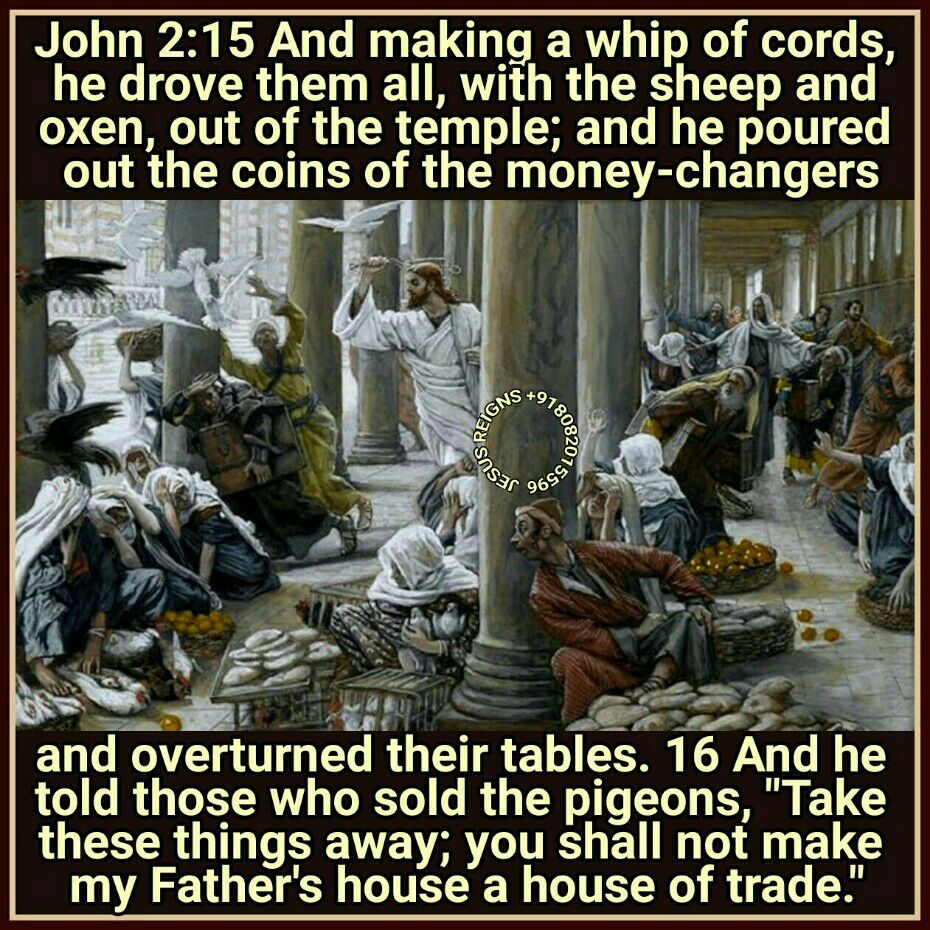 13 The Passover of the Jews was at hand, and Jesus went up to Jerusalem.14 In the temple he found those who were selling oxen and sheep and pigeons, and the money-changers at their business. 15 And making a whip of cords, he drove them all, with the sheep and oxen, out of the temple; and he poured out the coins of the money-changers and overturned their tables. 16 And he told those who sold the pigeons, "Take these things away; you shall not make my Father's house a house of trade." 17 His disciples remembered that it was written, "Zeal for your house will consume me." 18 The Jews then said to him, "What sign have you to show us for doing this?" 19 Jesus answered them, "Destroy this temple, and in three days I will raise it up." 20 The Jews then said, "It has taken forty-six years to build this temple, and will you raise it up in three days?" 21 But he spoke of the temple of his body. 22 When therefore he was raised from the dead, his disciples remembered that he had said this; and they believed the scripture and the word which Jesus had spoken. 23 Now when he was in Jerusalem at the Passover feast, many believed in his name when they saw the signs which he did; 24 but Jesus did not trust himself to them, 25 because he knew all men and needed no one to bear witness of man; for he himself knew what was in man.