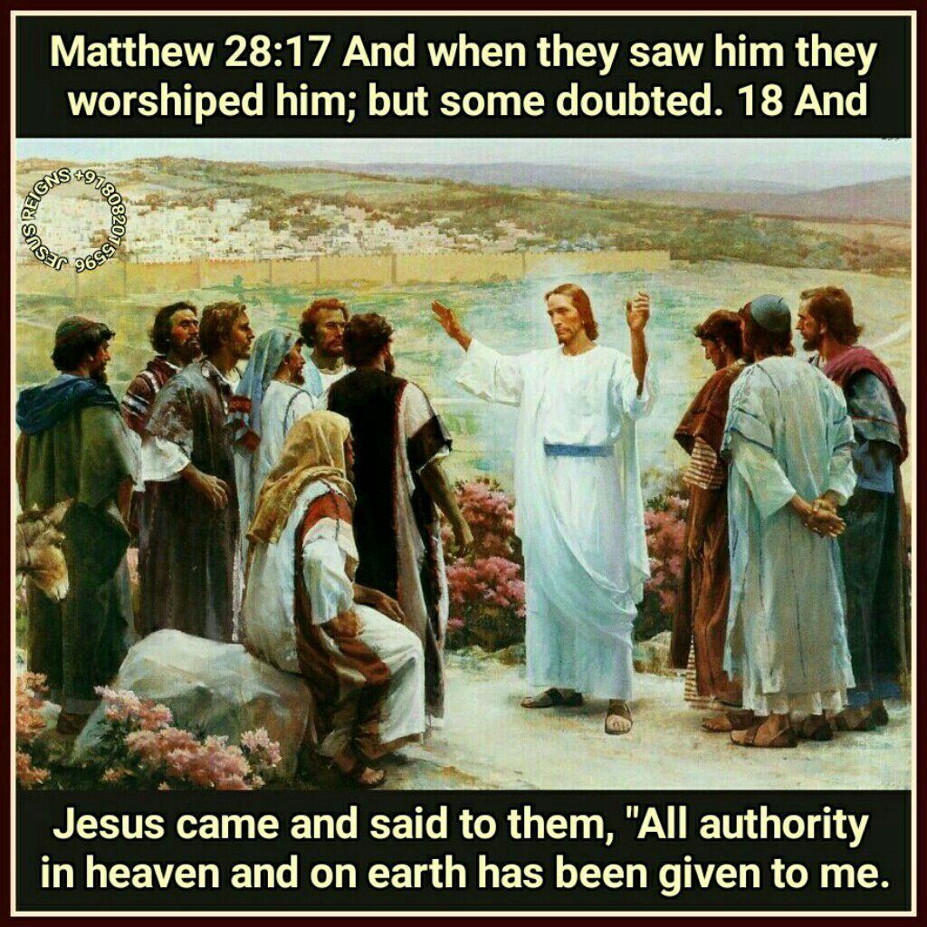 16 Now the eleven disciples went to Galilee, to the mountain to which Jesus had directed them. 17 And when they saw him they worshiped him; but some doubted. 18 And Jesus came and said to them, "All authority in heaven and on earth has been given to me. 19 Go therefore and make disciples of all nations, baptizing them in the name of the Father and of the Son and of the Holy Spirit,20 teaching them to observe all that I have commanded you; and lo, I am with you always, to the close of the age."