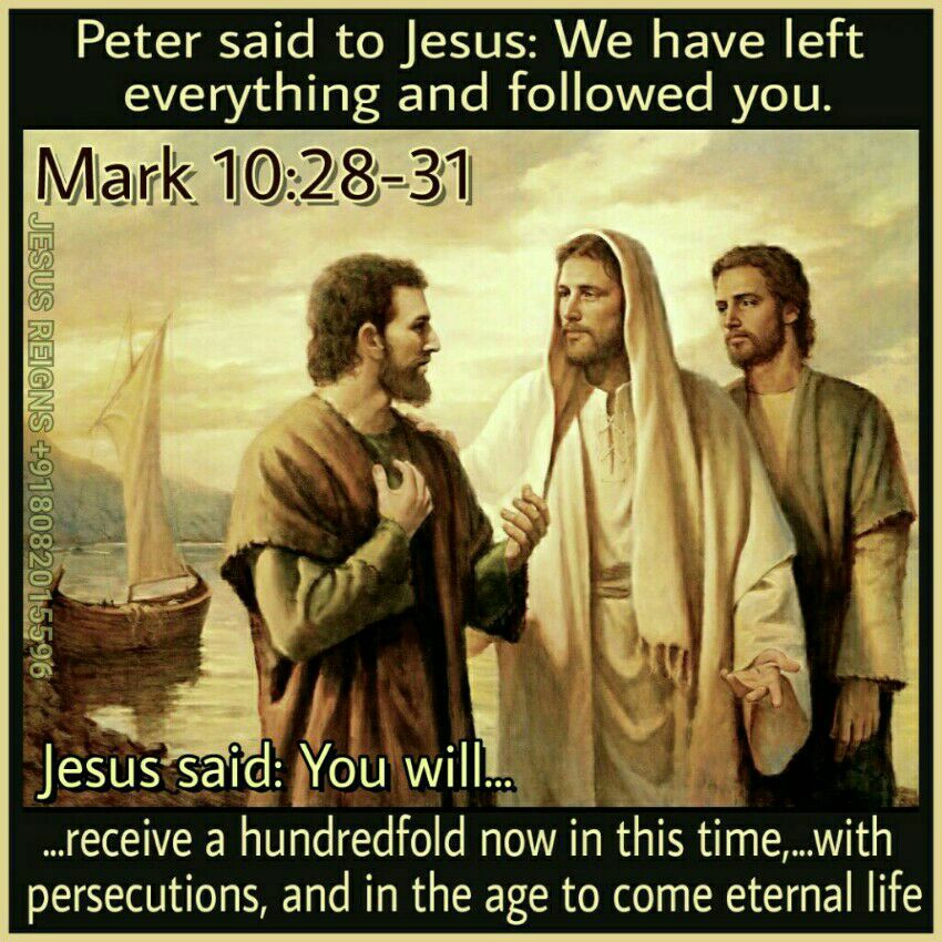 28 Peter began to say to him, "Behold, we have left everything and followed you." 29 Jesus said, "Truly, I say to you, there is no one who has left house or brothers or sisters or mother or father or children or lands, for my sake and for the gospel, 30 who will not receive a hundredfold now in this time, houses and brothers and sisters and mothers and children and lands, with persecutions, and in the age to come eternal life. 31 But many that are first will be last, and the last first."