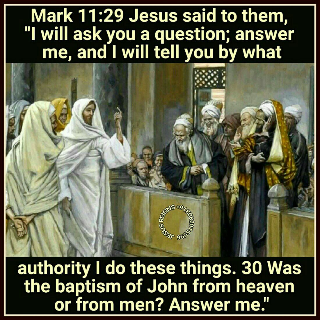 27 And they came again to Jerusalem. And as he was walking in the temple, the chief priests and the scribes and the elders came to him, 28 and they said to him, "By what authority are you doing these things, or who gave you this authority to do them?" 29 Jesus said to them, "I will ask you a question; answer me, and I will tell you by what authority I do these things. 30 Was the baptism of John from heaven or from men? Answer me." 31 And they argued with one another, "If we say, `From heaven,' he will say, `Why then did you not believe him?' 32 But shall we say, `From men'?" -- they were afraid of the people, for all held that John was a real prophet. 33 So they answered Jesus, "We do not know." And Jesus said to them, "Neither will I tell you by what authority I do these things."