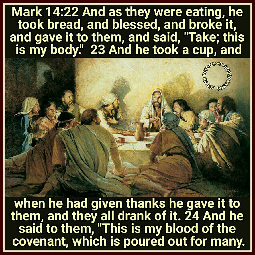 12 And on the first day of Unleavened Bread, when they sacrificed the passover lamb, his disciples said to him, "Where will you have us go and prepare for you to eat the passover?" 13 And he sent two of his disciples, and said to them, "Go into the city, and a man carrying a jar of water will meet you; follow him, 14 and wherever he enters, say to the householder, `The Teacher says, Where is my guest room, where I am to eat the passover with my disciples?' 15 And he will show you a large upper room furnished and ready; there prepare for us." 16 And the disciples set out and went to the city, and found it as he had told them; and they prepared the passover. 22 And as they were eating, he took bread, and blessed, and broke it, and gave it to them, and said, "Take; this is my body." 23 And he took a cup, and when he had given thanks he gave it to them, and they all drank of it. 24 And he said to them, "This is my blood of the covenant, which is poured out for many. 25 Truly, I say to you, I shall not drink again of the fruit of the vine until that day when I drink it new in the kingdom of God." 26 And when they had sung a hymn, they went out to the Mount of Olives.