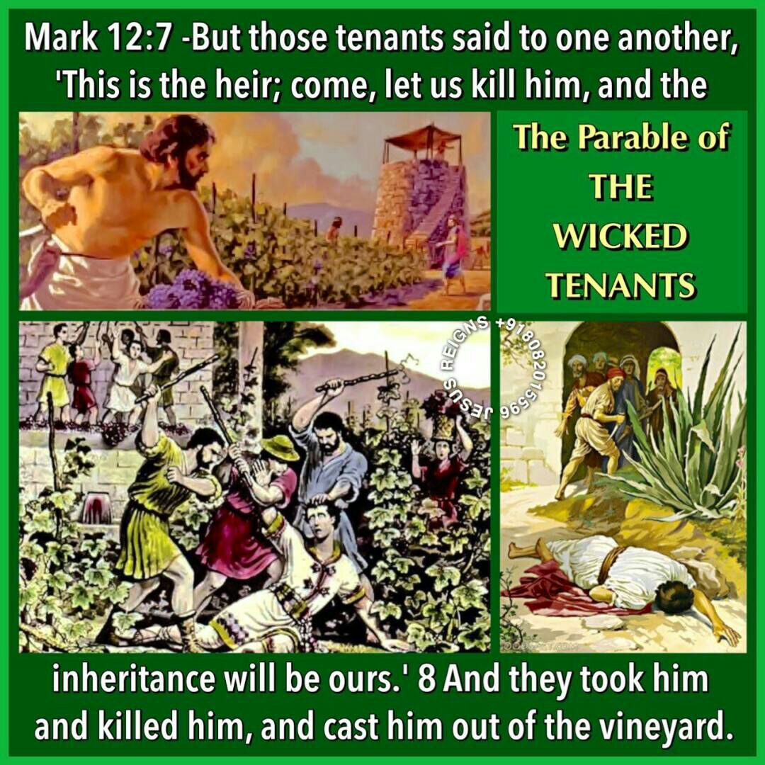 1 And he began to speak to them in parables. "A man planted a vineyard, and set a hedge around it, and dug a pit for the wine press, and built a tower, and let it out to tenants, and went into another country. 2 When the time came, he sent a servant to the tenants, to get from them some of the fruit of the vineyard. 3 And they took him and beat him, and sent him away empty-handed. 4 Again he sent to them another servant, and they wounded him in the head, and treated him shamefully. 5 And he sent another, and him they killed; and so with many others, some they beat and some they killed. 6 He had still one other, a beloved son; finally he sent him to them, saying, `They will respect my son.' 7 But those tenants said to one another, `This is the heir; come, let us kill him, and the inheritance will be ours.' 8 And they took him and killed him, and cast him out of the vineyard. 9 What will the owner of the vineyard do? He will come and destroy the tenants, and give the vineyard to others. 10 Have you not read this scripture: `The very stone which the builders rejected has become the head of the corner; 11 this was the Lord's doing, and it is marvelous in our eyes'?" 12 And they tried to arrest him, but feared the multitude, for they perceived that he had told the parable against them; so they left him and went away.