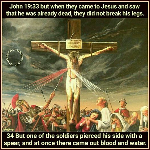 31 Since it was the day of Preparation, in order to prevent the bodies from remaining on the cross on the sabbath (for that sabbath was a high day), the Jews asked Pilate that their legs might be broken, and that they might be taken away. 32 So the soldiers came and broke the legs of the first, and of the other who had been crucified with him; 33 but when they came to Jesus and saw that he was already dead, they did not break his legs. 34 But one of the soldiers pierced his side with a spear, and at once there came out blood and water. 35 He who saw it has borne witness -- his testimony is true, and he knows that he tells the truth -- that you also may believe. 36 For these things took place that the scripture might be fulfilled, "Not a bone of him shall be broken." 37 And again another scripture says, "They shall look on him whom they have pierced."