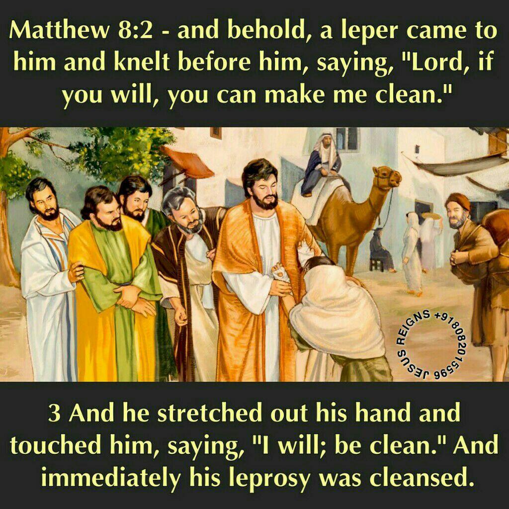 1 When he came down from the mountain, great crowds followed him; 2 and behold, a leper came to him and knelt before him, saying, "Lord, if you will, you can make me clean." 3 And he stretched out his hand and touched him, saying, "I will; be clean." And immediately his leprosy was cleansed. 4 And Jesus said to him, "See that you say nothing to any one; but go, show yourself to the priest, and offer the gift that Moses commanded, for a proof to the people."