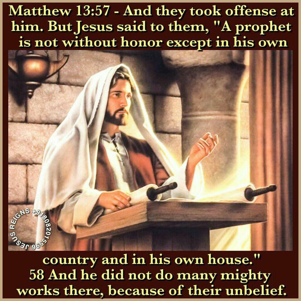 54 and coming to his own country he taught them in their synagogue, so that they were astonished, and said, "Where did this man get this wisdom and these mighty works? 55 Is not this the carpenter's son? Is not his mother called Mary? And are not his brothers James and Joseph and Simon and Judas? 56 And are not all his sisters with us? Where then did this man get all this?" 57 And they took offense at him. But Jesus said to them, "A prophet is not without honor except in his own country and in his own house." 58 And he did not do many mighty works there, because of their unbelief.
