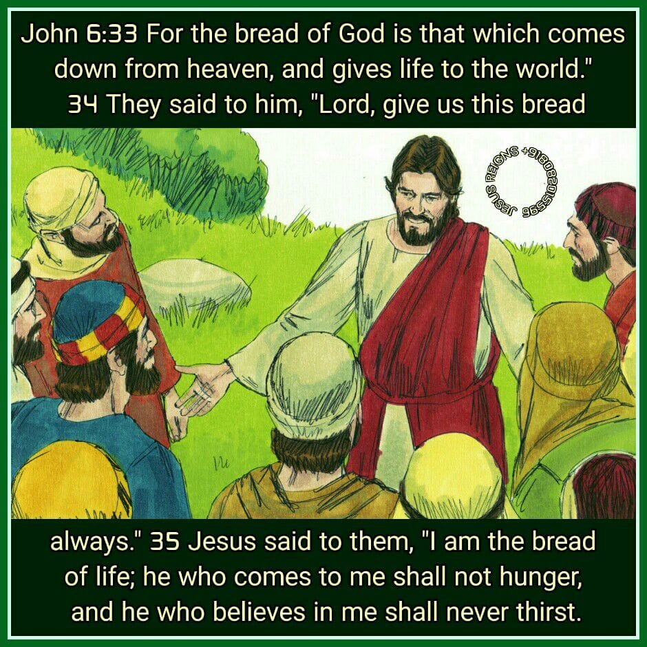 24 So when the people saw that Jesus was not there, nor his disciples, they themselves got into the boats and went to Capernaum, seeking Jesus. 25 When they found him on the other side of the sea, they said to him, "Rabbi, when did you come here?" 26 Jesus answered them, "Truly, truly, I say to you, you seek me, not because you saw signs, but because you ate your fill of the loaves. 27 Do not labor for the food which perishes, but for the food which endures to eternal life, which the Son of man will give to you; for on him has God the Father set his seal." 28 Then they said to him, "What must we do, to be doing the works of God?" 29 Jesus answered them, "This is the work of God, that you believe in him whom he has sent." 30 So they said to him, "Then what sign do you do, that we may see, and believe you? What work do you perform? 31 Our fathers ate the manna in the wilderness; as it is written, `He gave them bread from heaven to eat.'" 32 Jesus then said to them, "Truly, truly, I say to you, it was not Moses who gave you the bread from heaven; my Father gives you the true bread from heaven. 33 For the bread of God is that which comes down from heaven, and gives life to the world." 34 They said to him, "Lord, give us this bread always." 35 Jesus said to them, "I am the bread of life; he who comes to me shall not hunger, and he who believes in me shall never thirst.