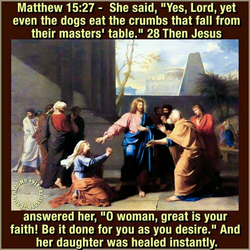 21 And Jesus went away from there and withdrew to the district of Tyre and Sidon. 22 And behold, a Canaanite woman from that region came out and cried, "Have mercy on me, O Lord, Son of David; my daughter is severely possessed by a demon." 23 But he did not answer her a word. And his disciples came and begged him, saying, "Send her away, for she is crying after us." 24 He answered, "I was sent only to the lost sheep of the house of Israel." 25 But she came and knelt before him, saying, "Lord, help me." 26 And he answered, "It is not fair to take the children's bread and throw it to the dogs." 27 She said, "Yes, Lord, yet even the dogs eat the crumbs that fall from their masters' table." 28 Then Jesus answered her, "O woman, great is your faith! Be it done for you as you desire." And her daughter was healed instantly.