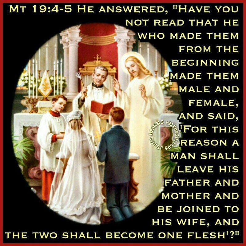 3 And Pharisees came up to him and tested him by asking, "Is it lawful to divorce one's wife for any cause?" 4 He answered, "Have you not read that he who made them from the beginning made them male and female, 5 and said, `For this reason a man shall leave his father and mother and be joined to his wife, and the two shall become one flesh'? 6 So they are no longer two but one flesh. What therefore God has joined together, let not man put asunder." 7 They said to him, "Why then did Moses command one to give a certificate of divorce, and to put her away?" 8 He said to them, "For your hardness of heart Moses allowed you to divorce your wives, but from the beginning it was not so. 9 And I say to you: whoever divorces his wife, except for unchastity, and marries another, commits adultery." 10 The disciples said to him, "If such is the case of a man with his wife, it is not expedient to marry." 11 But he said to them, "Not all men can receive this saying, but only those to whom it is given. 12 For there are eunuchs who have been so from birth, and there are eunuchs who have been made eunuchs by men, and there are eunuchs who have made themselves eunuchs for the sake of the kingdom of heaven. He who is able to receive this, let him receive it."