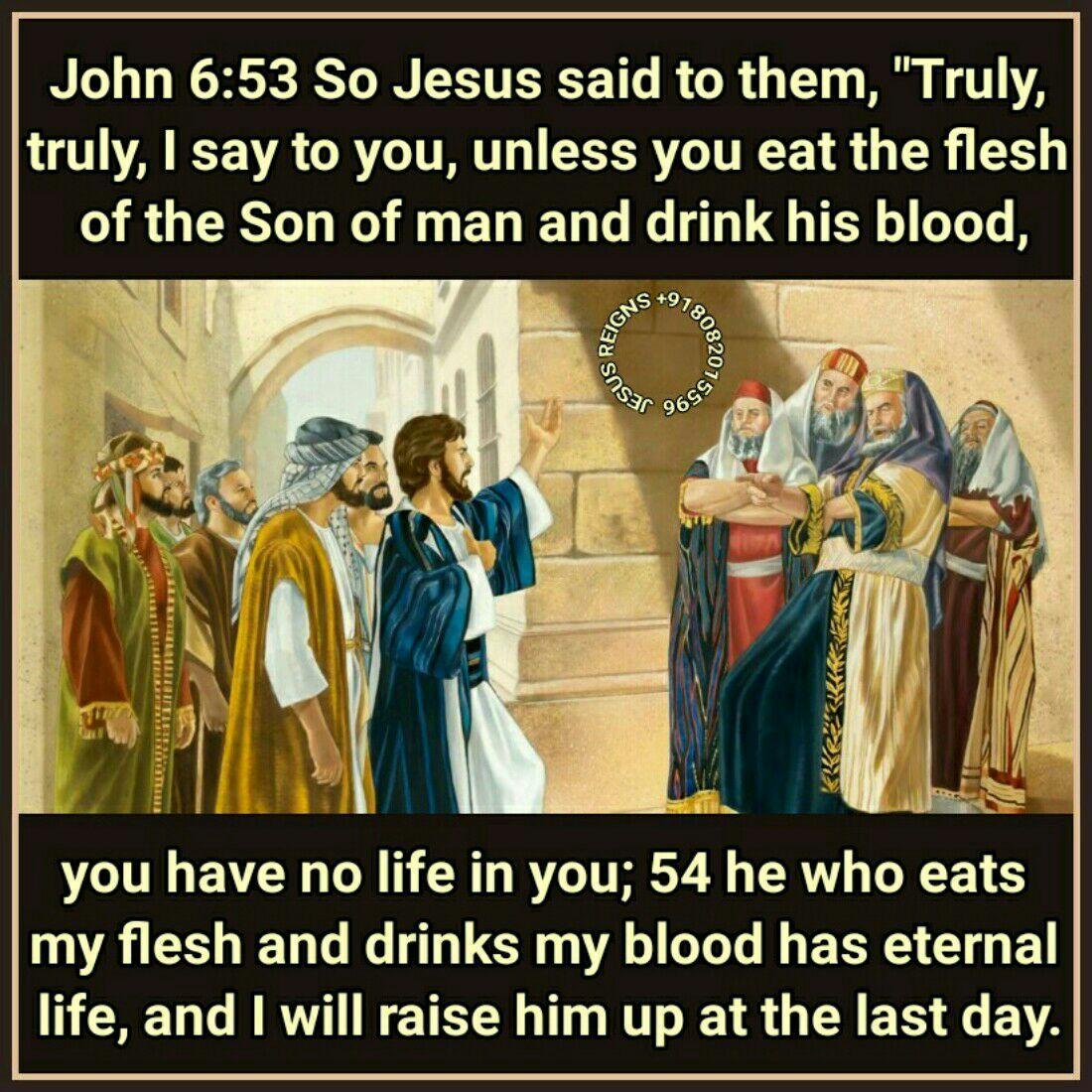 51 "I am the living bread which came down from heaven; if any one eats of this bread, he will live for ever; and the bread which I shall give for the life of the world is my flesh." 52 The Jews then disputed among themselves, saying, "How can this man give us his flesh to eat?" 53 So Jesus said to them, ", truly, I say to you, unless you eat the flesh of the Son of man and drink his blood, you have no life in you; 54 he who eats my flesh and drinks my blood has eternal life, and I will raise him up at the last day. 55 For my flesh is food indeed, and my blood is drink indeed. 56 He who eats my flesh and drinks my blood abides in me, and I in him. 57 As the living Father sent me, and I live because of the Father, so he who eats me will live because of me. 58 This is the bread which came down from heaven, not such as the fathers ate and died; he who eats this bread will live for ever."