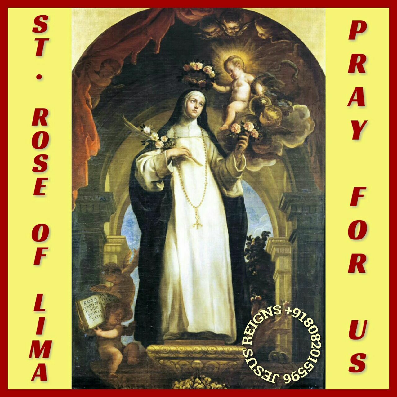 PRAYER: O God, you set Saint Rose of Lima on fire with your love, so that, secluded from the world in the austerity of a life of penance, she might give herself to you alone; grant, we pray, that through her intercession, we may tread the paths of life on earth and drink at the stream of your delights in heaven. Through our Lord Jesus Christ, your Son, who lives and reigns with you in the unity of the Holy Spirit, one God, for ever and ever. Amen.