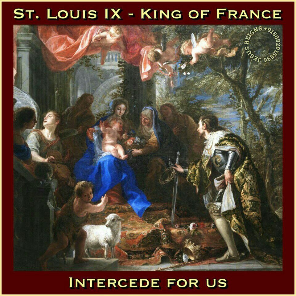 PRAYER: O God, who brought Saint Louis from the cares of earthly rule to the glory of a heavenly realm, grant, we pray, through his intercession, that, by fulfilling our duties on earth, we may seek out your eternal Kingdom. Through our Lord Jesus Christ, your Son, who lives and reigns with you in the unity of the Holy Spirit, one God, for ever and ever. Amen.