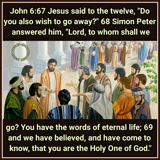 60 Many of his disciples, when they heard it, said, "This is a hard saying; who can listen to it?" 61 But Jesus, knowing in himself that his disciples murmured at it, said to them, "Do you take offense at this? 62 Then what if you were to see the Son of man ascending where he was before? 63 It is the spirit that gives life, the flesh is of no avail; the words that I have spoken to you are spirit and life. 64 But there are some of you that do not believe." For Jesus knew from the first who those were that did not believe, and who it was that would betray him. 65 And he said, "This is why I told you that no one can come to me unless it is granted him by the Father." 66 After this many of his disciples drew back and no longer went about with him. 67 Jesus said to the twelve, "Do you also wish to go away?" 68 Simon Peter answered him, "Lord, to whom shall we go? You have the words of eternal life; 69 and we have believed, and have come to know, that you are the Holy One of God."