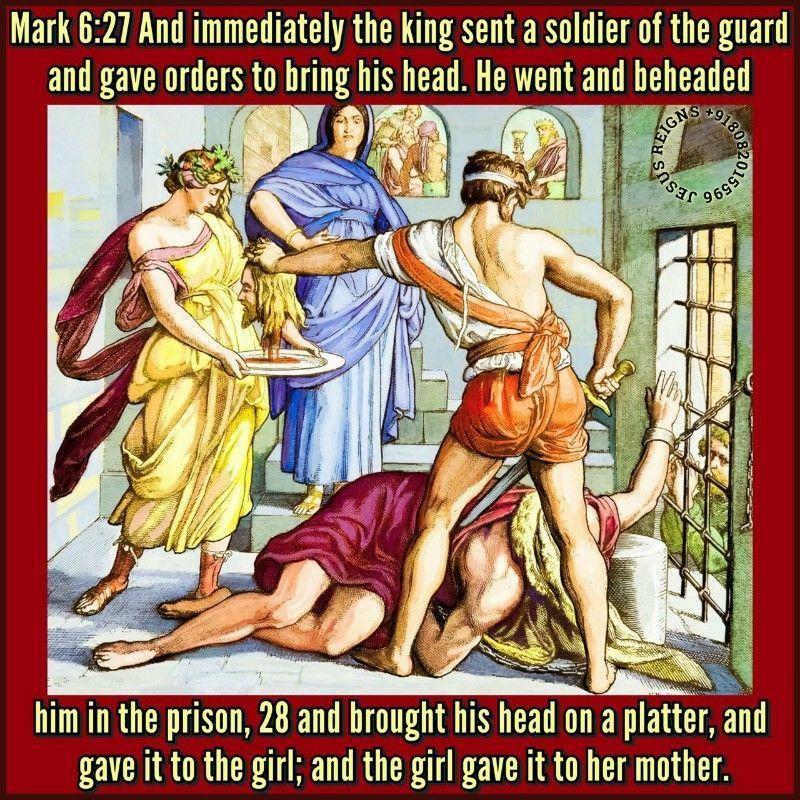 17 For Herod had sent and seized John, and bound him in prison for the sake of Herodias, his brother Philip's wife; because he had married her. 18 For John said to Herod, "It is not lawful for you to have your brother's wife." 19 And Herodias had a grudge against him, and wanted to kill him. But she could not, 20 for Herod feared John, knowing that he was a righteous and holy man, and kept him safe. When he heard him, he was much perplexed; and yet he heard him gladly. 21 But an opportunity came when Herod on his birthday gave a banquet for his courtiers and officers and the leading men of Galilee. 22 For when Herodias' daughter came in and danced, she pleased Herod and his guests; and the king said to the girl, "Ask me for whatever you wish, and I will grant it." 23 And he vowed to her, "Whatever you ask me, I will give you, even half of my kingdom." 24 And she went out, and said to her mother, "What shall I ask?" And she said, "The head of John the baptizer." 25 And she came in immediately with haste to the king, and asked, saying, "I want you to give me at once the head of John the Baptist on a platter." 26 And the king was exceedingly sorry; but because of his oaths and his guests he did not want to break his word to her. 27 And immediately the king sent a soldier of the guard and gave orders to bring his head. He went and beheaded him in the prison, 28 and brought his head on a platter, and gave it to the girl; and the girl gave it to her mother. 29 When his disciples heard of it, they came and took his body, and laid it in a tomb.