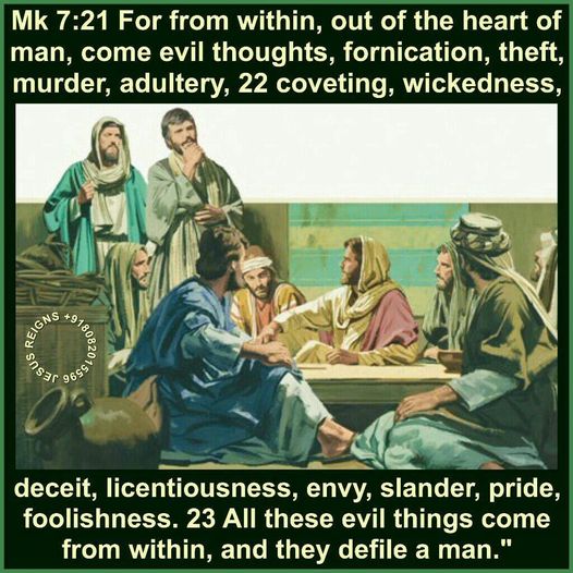 21 For from within, out of the heart of man, come evil thoughts, fornication, theft, murder, adultery, 22 coveting, wickedness, deceit, licentiousness, envy, slander, pride, foolishness. 23 All these evil things come from within, and they defile a man."