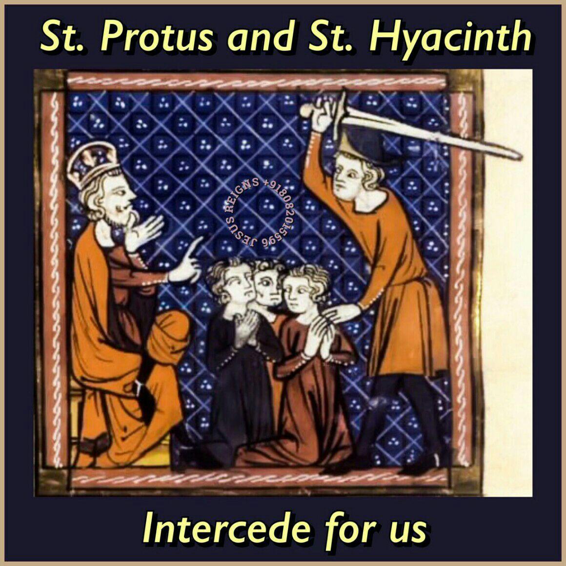 PRAYER: May the glorious profession of faith of your blessed martyrs Protus and Hyacinth strengthen us, O Lord, and may the power of their intercession shield us. Through our Lord Jesus Christ, Your Son, who being God, lives and reigns with You in the unity of the same Holy Spirit, for ever and ever. Amen.
