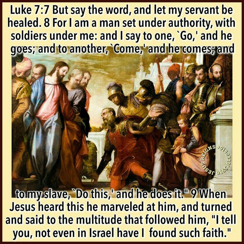 1 After he had ended all his sayings in the hearing of the people he entered Caper'na-um. 2 Now a centurion had a slave who was dear to him, who was sick and at the point of death. 3 When he heard of Jesus, he sent to him elders of the Jews, asking him to come and heal his slave. 4 And when they came to Jesus, they besought him earnestly, saying, "He is worthy to have you do this for him, 5 for he loves our nation, and he built us our synagogue."6 And Jesus went with them. When he was not far from the house, the centurion sent friends to him, saying to him, "Lord, do not trouble yourself, for I am not worthy to have you come under my roof; 7 therefore I did not presume to come to you. But say the word, and let my servant be healed. 8 For I am a man set under authority, with soldiers under me: and I say to one, `Go,' and he goes; and to another, `Come,' and he comes; and to my slave, `Do this,' and he does it." 9 When Jesus heard this he marveled at him, and turned and said to the multitude that followed him, "I tell you, not even in Israel have I found such faith." 10 And when those who had been sent returned to the house, they found the slave well.