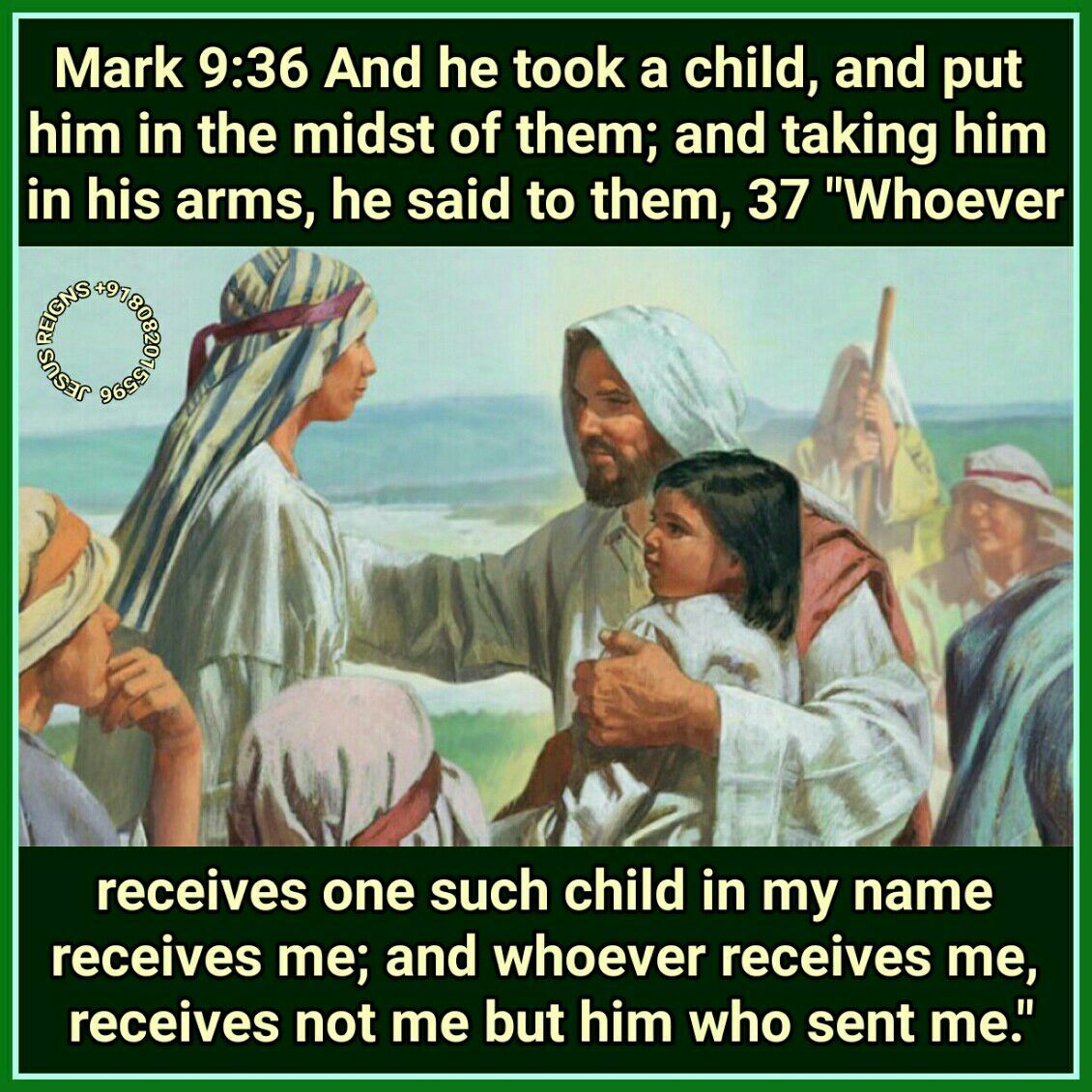 30 They went on from there and passed through Galilee. And he would not have any one know it; 31 for he was teaching his disciples, saying to them, "The Son of man will be delivered into the hands of men, and they will kill him; and when he is killed, after three days he will rise." 32 But they did not understand the saying, and they were afraid to ask him. 33 And they came to Capernaum; and when he was in the house he asked them, "What were you discussing on the way?" 34 But they were silent; for on the way they had discussed with one another who was the greatest. 35 And he sat down and called the twelve; and he said to them, "If any one would be first, he must be last of all and servant of all." 36 And he took a child, and put him in the midst of them; and taking him in his arms, he said to them, 37 "Whoever receives one such child in my name receives me; and whoever receives me, receives not me but him who sent me."