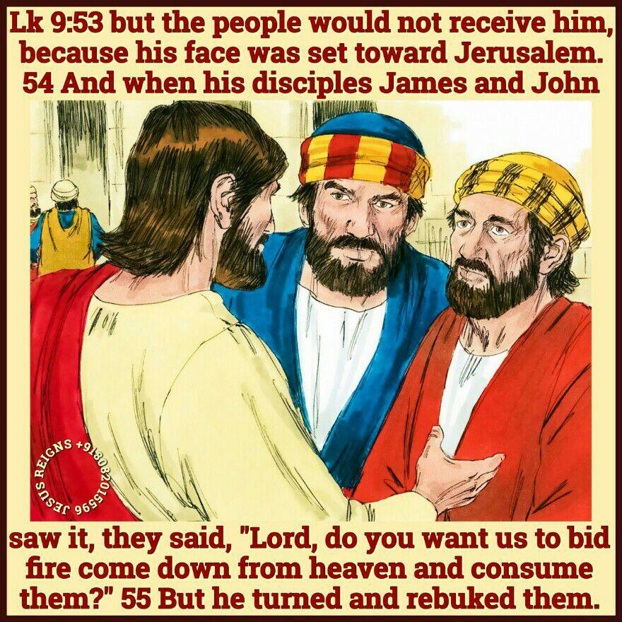 51 When the days drew near for him to be received up, he set his face to go to Jerusalem. 52 And he sent messengers ahead of him, who went and entered a village of the Samaritans, to make ready for him; 53 but the people would not receive him, because his face was set toward Jerusalem. 54 And when his disciples James and John saw it, they said, "Lord, do you want us to bid fire come down from heaven and consume them?" 55 But he turned and rebuked them. 56 And they went on to another village.