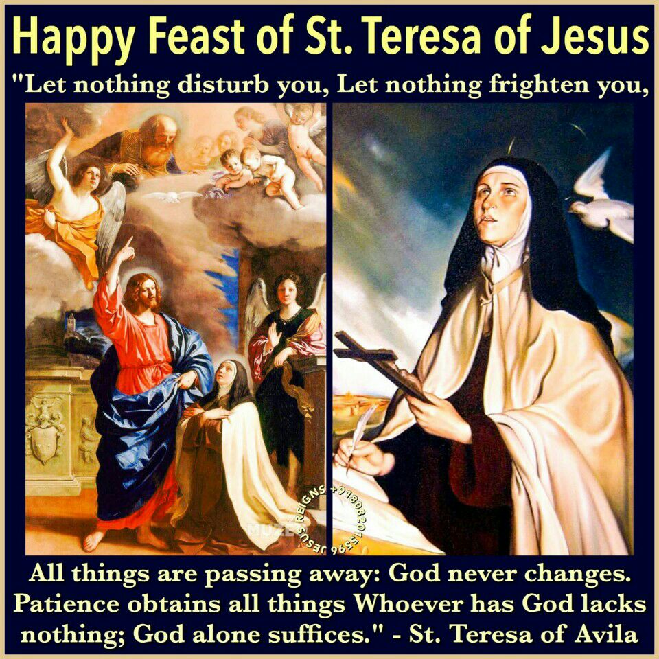 PRAYER: O God, who through your Spirit raised up Saint Teresa of Jesus to show the Church the way to seek perfection, grant that we may always be nourished by the food of her heavenly teaching and fired with longing for true holiness. Through our Lord Jesus Christ, your Son, who lives and reigns with you in the unity of the Holy Spirit, one God, for ever and ever. Amen.