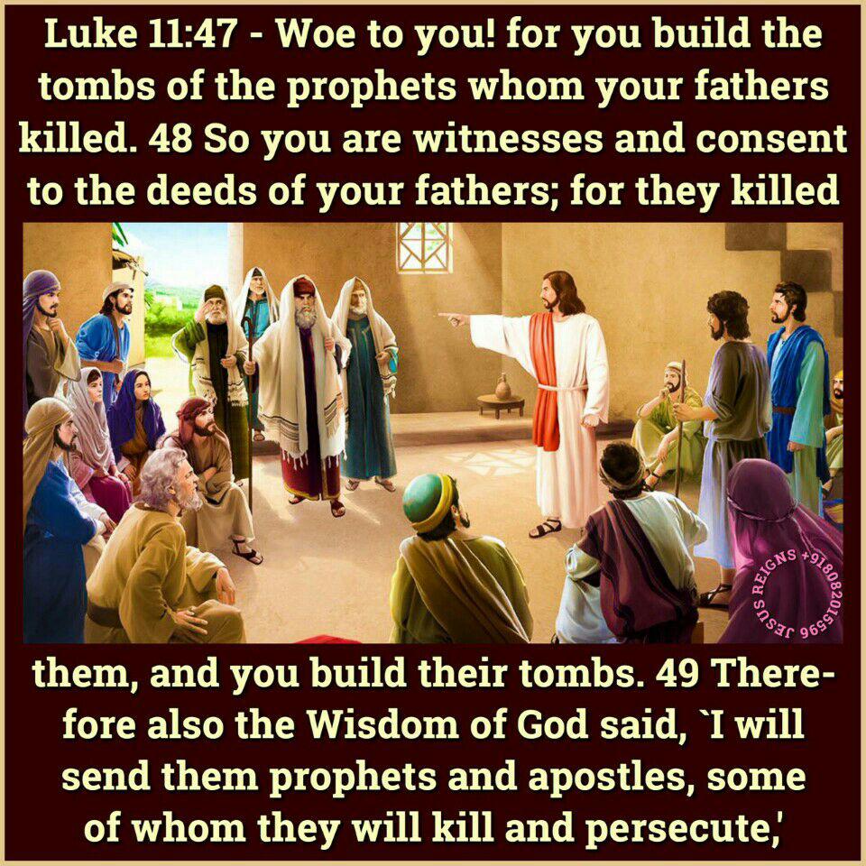 47 Woe to you! for you build the tombs of the prophets whom your fathers killed. 48 So you are witnesses and consent to the deeds of your fathers; for they killed them, and you build their tombs. 49 Therefore also the Wisdom of God said, `I will send them prophets and apostles, some of whom they will kill and persecute,' 50 that the blood of all the prophets, shed from the foundation of the world, may be required of this generation, 51 from the blood of Abel to the blood of Zechariah, who perished between the altar and the sanctuary. Yes, I tell you, it shall be required of this generation. 52 Woe to you lawyers! for you have taken away the key of knowledge; you did not enter yourselves, and you hindered those who were entering." 53 As he went away from there, the scribes and the Pharisees began to press him hard, and to provoke him to speak of many things, 54 lying in wait for him, to catch at something he might say.