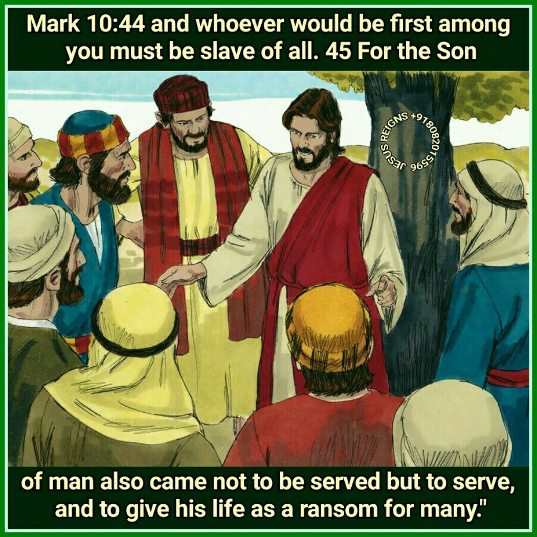 35 And James and John, the sons of Zebedee, came forward to him, and said to him, "Teacher, we want you to do for us whatever we ask of you." 36 And he said to them, "What do you want me to do for you?" 37 And they said to him, "Grant us to sit, one at your right hand and one at your left, in your glory." 38 But Jesus said to them, "You do not know what you are asking. Are you able to drink the cup that I drink, or to be baptized with the baptism with which I am baptized?" 39 And they said to him, "We are able." And Jesus said to them, "The cup that I drink you will drink; and with the baptism with which I am baptized, you will be baptized; 40 but to sit at my right hand or at my left is not mine to grant, but it is for those for whom it has been prepared." 41 And when the ten heard it, they began to be indignant at James and John. 42 And Jesus called them to him and said to them, "You know that those who are supposed to rule over the Gentiles lord it over them, and their great men exercise authority over them. 43 But it shall not be so among you; but whoever would be great among you must be your servant, 44 and whoever would be first among you must be slave of all. 45 For the Son of man also came not to be served but to serve, and to give his life as a ransom for many."
