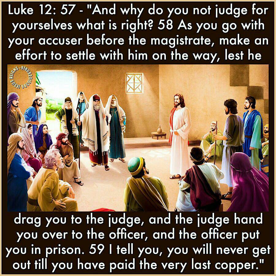 54 He also said to the multitudes, "When you see a cloud rising in the west, you say at once, A shower is coming'; and so it happens. 55 And when you see the south wind blowing, you say, There will be scorching heat'; and it happens. 56 You hypocrites! You know how to interpret the appearance of earth and sky; but why do you not know how to interpret the present time? 57 "And why do you not judge for yourselves what is right? 58 As you go with your accuser before the magistrate, make an effort to settle with him on the way, lest he drag you to the judge, and the judge hand you over to the officer, and the officer put you in prison. 59 I tell you, you will never get out till you have paid the very last copper."