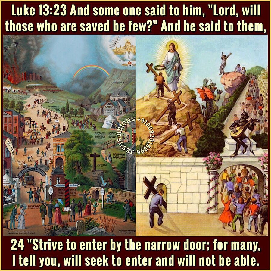 22 He went on his way through towns and villages, teaching, and journeying toward Jerusalem. 23 And some one said to him, "Lord, will those who are saved be few?" And he said to them, 24 "Strive to enter by the narrow door; for many, I tell you, will seek to enter and will not be able. 25 When once the householder has risen up and shut the door, you will begin to stand outside and to knock at the door, saying, `Lord, open to us.' He will answer you, `I do not know where you come from.' 26 Then you will begin to say, `We ate and drank in your presence, and you taught in our streets.' 27 But he will say, `I tell you, I do not know where you come from; depart from me, all you workers of iniquity!' 28 There you will weep and gnash your teeth, when you see Abraham and Isaac and Jacob and all the prophets in the kingdom of God and you yourselves thrust out. 29 And men will come from east and west, and from north and south, and sit at table in the kingdom of God. 30 And behold, some are last who will be first, and some are first who will be last."
