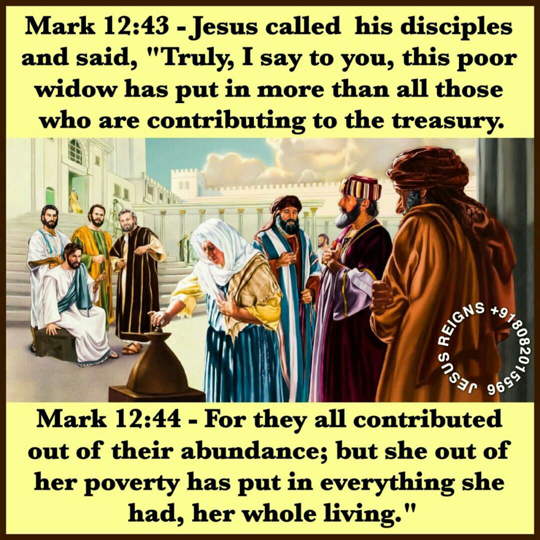 38 And in his teaching he said, "Beware of the scribes, who like to go about in long robes, and to have salutations in the market places 39 and the best seats in the synagogues and the places of honor at feasts, 40 who devour widows' houses and for a pretense make long prayers. They will receive the greater condemnation." 41 And he sat down opposite the treasury, and watched the multitude putting money into the treasury. Many rich people put in large sums. 42 And a poor widow came, and put in two copper coins, which make a penny. 43 And he called his disciples to him, and said to them, "Truly, I say to you, this poor widow has put in more than all those who are contributing to the treasury. 44 For they all contributed out of their abundance; but she out of her poverty has put in everything she had, her whole living."