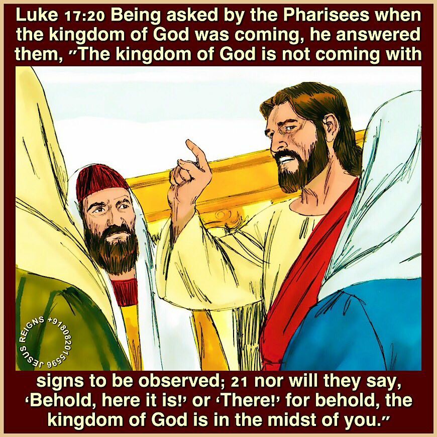 20 Being asked by the Pharisees when the kingdom of God was coming, he answered them, "The kingdom of God is not coming with signs to be observed; 21 nor will they say, Behold, here it is!' or There!' for behold, the kingdom of God is in the midst of you." 22 And he said to the disciples, "The days are coming when you will desire to see one of the days of the Son of man, and you will not see it. 23 And they will say to you, Behold, there!' or Behold, here!' Do not go, do not follow them. 24 For as the lightning flashes and lights up the sky from one side to the other, so will the Son of man be in his day. 25 But first he must suffer many things and be rejected by this generation.