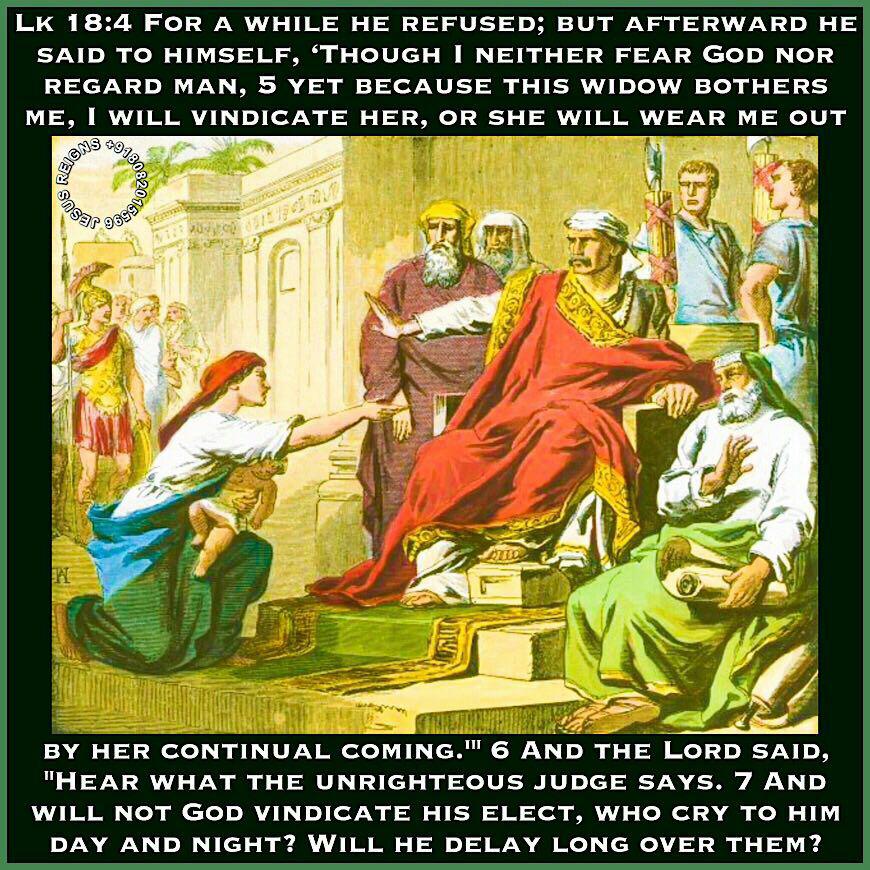 1 And he told them a parable, to the effect that they ought always to pray and not lose heart. 2 He said, "In a certain city there was a judge who neither feared God nor regarded man; 3 and there was a widow in that city who kept coming to him and saying, Vindicate me against my adversary.' 4 For a while he refused; but afterward he said to himself, Though I neither fear God nor regard man, 5 yet because this widow bothers me, I will vindicate her, or she will wear me out by her continual coming.'" 6 And the Lord said, "Hear what the unrighteous judge says. 7 And will not God vindicate his elect, who cry to him day and night? Will he delay long over them? 8 I tell you, he will vindicate them speedily. Nevertheless, when the Son of man comes, will he find faith on earth?"