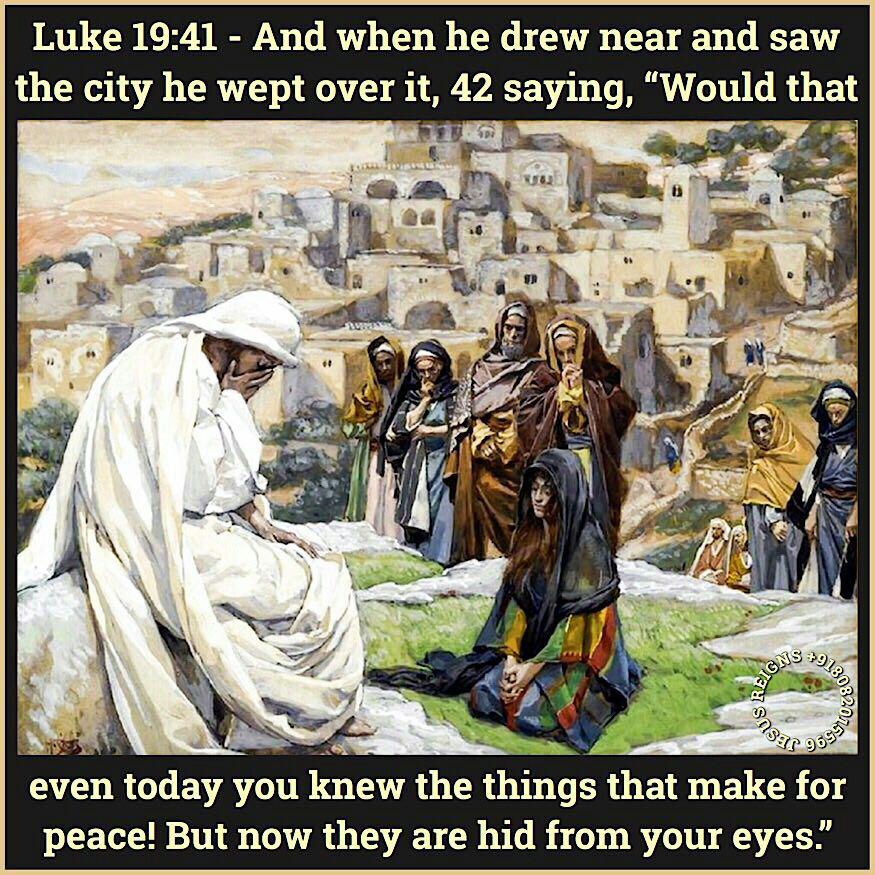 41 And when he drew near and saw the city he wept over it, 42 saying, "Would that even today you knew the things that make for peace! But now they are hid from your eyes. 43 For the days shall come upon you, when your enemies will cast up a bank about you and surround you, and hem you in on every side, 44 and dash you to the ground, you and your children within you, and they will not leave one stone upon another in you; because you did not know the time of your visitation."