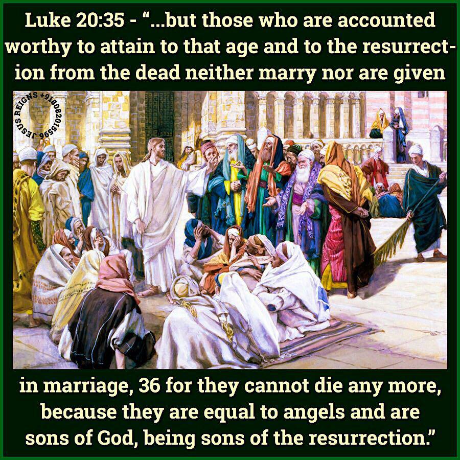 34 And Jesus said to them, "The sons of this age marry and are given in marriage; 35 but those who are accounted worthy to attain to that age and to the resurrection from the dead neither marry nor are given in marriage, 36 for they cannot die any more, because they are equal to angels and are sons of God, being sons of the resurrection. 37 But that the dead are raised, even Moses showed, in the passage about the bush, where he calls the Lord the God of Abraham and the God of Isaac and the God of Jacob. 38 Now he is not God of the dead, but of the living; for all live to him." 39 And some of the scribes answered, "Teacher, you have spoken well." 40 For they no longer dared to ask him any question.