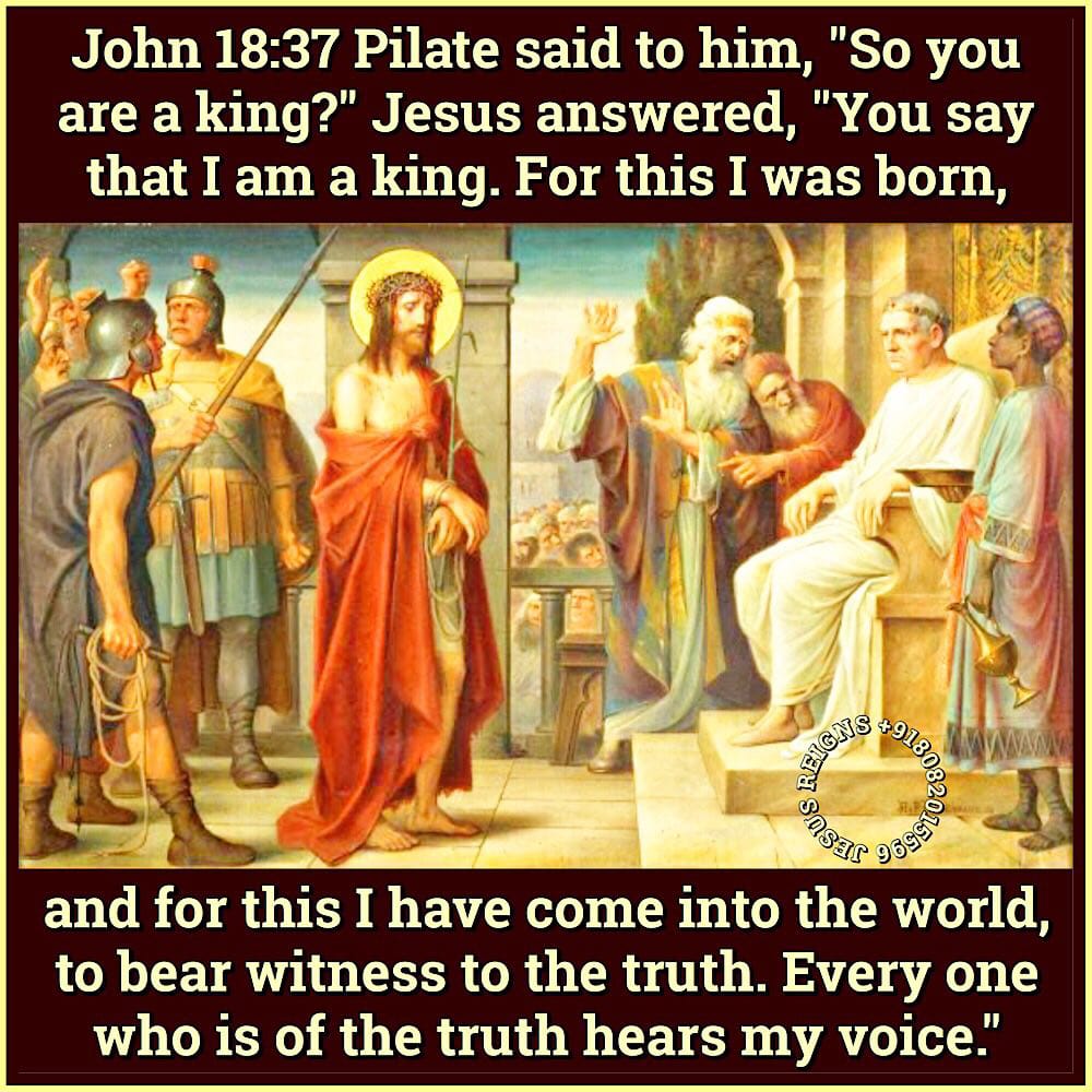 33 Pilate entered the praetorium again and called Jesus, and said to him, "Are you the King of the Jews?" 34 Jesus answered, "Do you say this of your own accord, or did others say it to you about me?" 35 Pilate answered, "Am I a Jew? Your own nation and the chief priests have handed you over to me; what have you done?" 36 Jesus answered, "My kingship is not of this world; if my kingship were of this world, my servants would fight, that I might not be handed over to the Jews; but my kingship is not from the world." 37 Pilate said to him, "So you are a king?" Jesus answered, "You say that I am a king. For this I was born, and for this I have come into the world, to bear witness to the truth. Every one who is of the truth hears my voice."