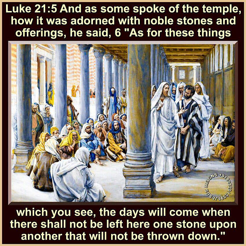 5 And as some spoke of the temple, how it was adorned with noble stones and offerings, he said, 6 "As for these things which you see, the days will come when there shall not be left here one stone upon another that will not be thrown down." 7 And they asked him, "Teacher, when will this be, and what will be the sign when this is about to take place?" 8 And he said, "Take heed that you are not led astray; for many will come in my name, saying, I am he!' and, The time is at hand!' Do not go after them. 9 And when you hear of wars and tumults, do not be terrified; for this must first take place, but the end will not be at once." 10 Then he said to them, "Nation will rise against nation, and kingdom against kingdom; 11 there will be great earthquakes, and in various places famines and pestilences; and there will be terrors and great signs from heaven.