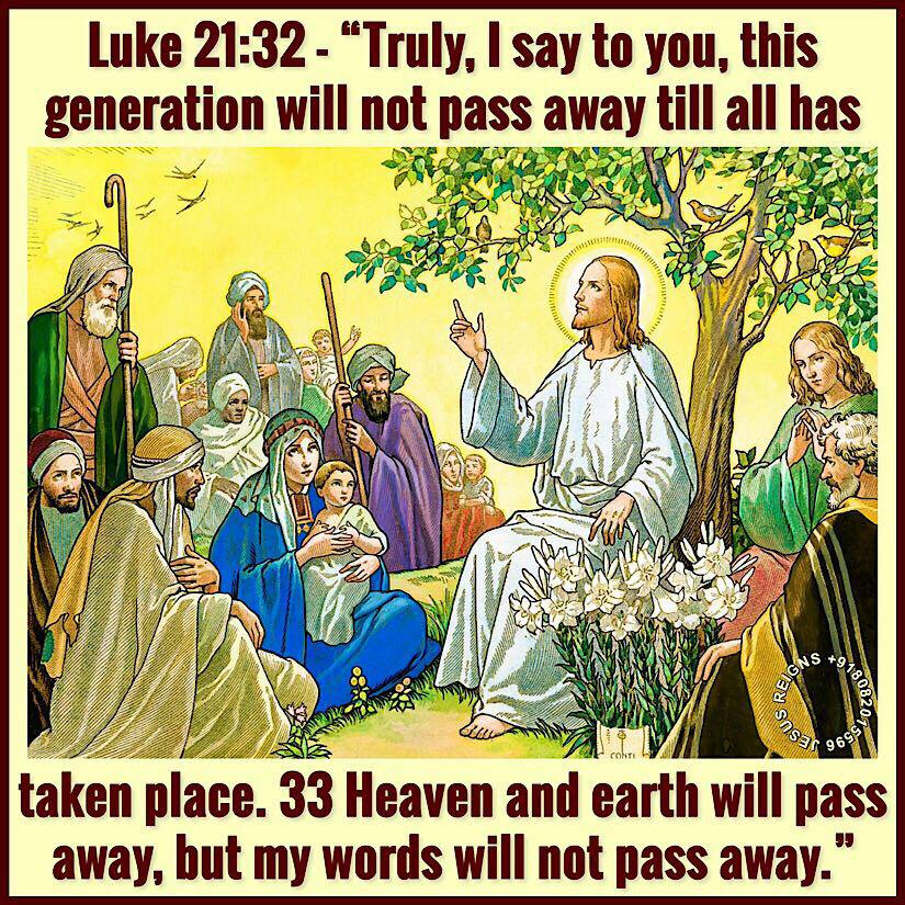 29 And he told them a parable: "Look at the fig tree, and all the trees; 30 as soon as they come out in leaf, you see for yourselves and know that the summer is already near. 31 So also, when you see these things taking place, you know that the kingdom of God is near. 32 Truly, I say to you, this generation will not pass away till all has taken place. 33 Heaven and earth will pass away, but my words will not pass away.