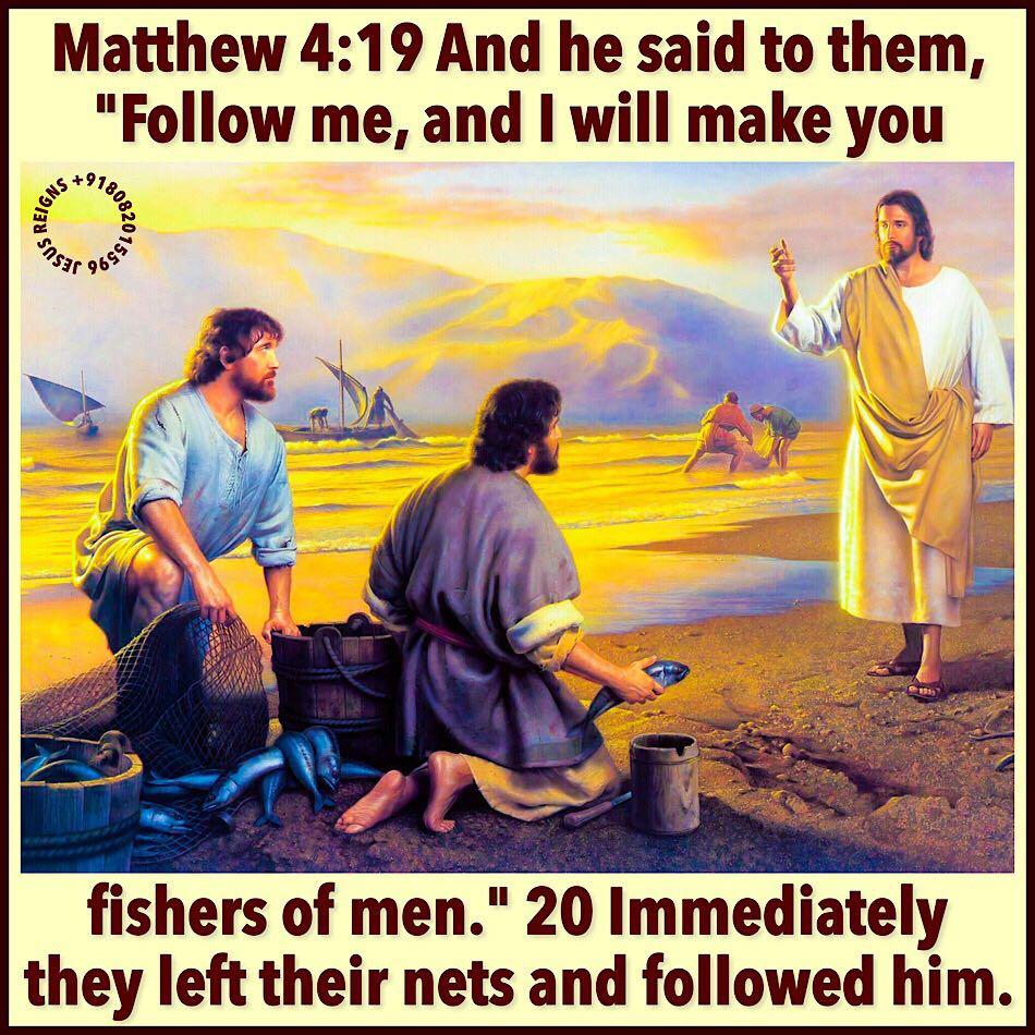 18 As he walked by the Sea of Galilee, he saw two brothers, Simon who is called Peter and Andrew his brother, casting a net into the sea; for they were fishermen. 19 And he said to them, "Follow me, and I will make you fishers of men." 20 Immediately they left their nets and followed him. 21 And going on from there he saw two other brothers, James the son of Zebedee and John his brother, in the boat with Zebedee their father, mending their nets, and he called them. 22 Immediately they left the boat and their father, and followed him.