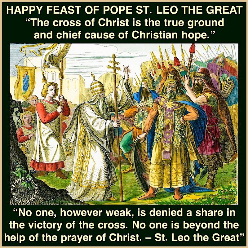 PRAYER: O God, who never allow the gates of hell to prevail against your Church, firmly founded on the apostolic rock, grant her, we pray, that through the intercession of Pope Saint Leo, she may stand firm in your truth and know the protection of lasting peace. Through our Lord Jesus Christ, your Son, who lives and reigns with you in the unity of the Holy Spirit, one God, for ever and ever. Amen.