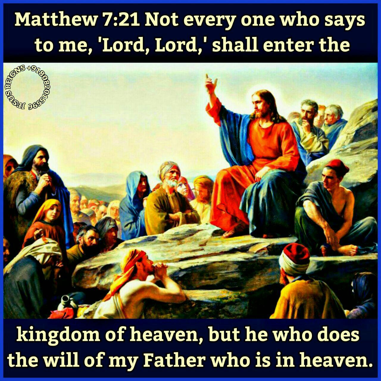 21 "Not every one who says to me, `Lord, Lord,' shall enter the kingdom of heaven, but he who does the will of my Father who is in heaven. 24 Every one then who hears these words of mine and does them will be like a wise man who built his house upon the rock; 25 and the rain fell, and the floods came, and the winds blew and beat upon that house, but it did not fall, because it had been founded on the rock. 26 And every one who hears these words of mine and does not do them will be like a foolish man who built his house upon the sand; 27 and the rain fell, and the floods came, and the winds blew and beat against that house, and it fell; and great was the fall of it."