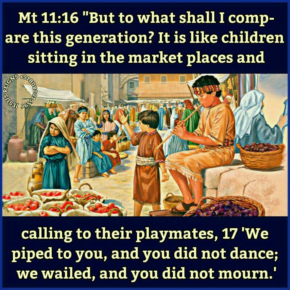 16 "But to what shall I compare this generation? It is like children sitting in the market places and calling to their playmates, 17 We piped to you, and you did not dance; we wailed, and you did not mourn.' 18 For John came neither eating nor drinking, and they say, He has a demon'; 19 the Son of man came eating and drinking, and they say, `Behold, a glutton and a drunkard, a friend of tax collectors and sinners!' Yet wisdom is justified by her deeds."