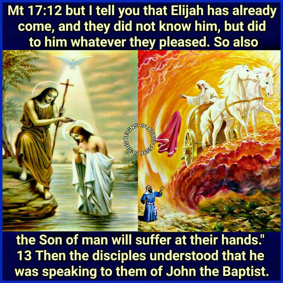9 And as they were coming down the mountain 10 the disciples asked him, "Then why do the scribes say that first Elijah must come?" 11 He replied, "Elijah does come, and he is to restore all things; 12 but I tell you that Elijah has already come, and they did not know him, but did to him whatever they pleased. So also the Son of man will suffer at their hands." 13 Then the disciples understood that he was speaking to them of John the Baptist.