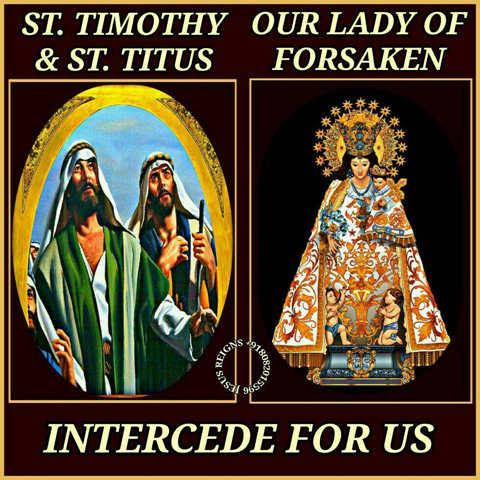 PRAYER: O God, who adorned Saints Timothy and Titus with apostolic virtues, grant through the intercession of them both, that, living justly and devoutly in this present age, we may merit to reach our heavenly homeland. Through our Lord Jesus Christ, your Son, who lives and reigns with you in the unity of the Holy Spirit, one God, for ever and ever. Amen.