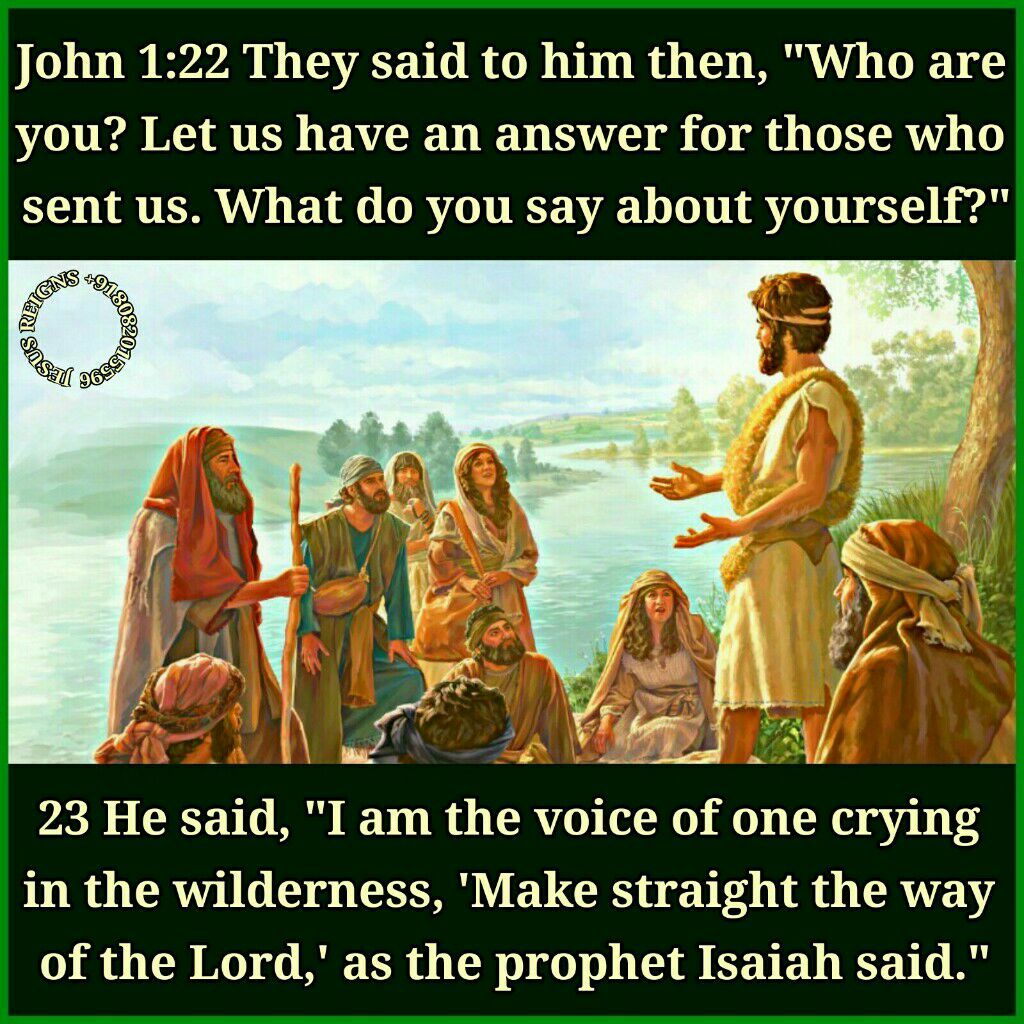 19 And this is the testimony of John, when the Jews sent priests and Levites from Jerusalem to ask him, "Who are you?" 20 He confessed, he did not deny, but confessed, "I am not the Christ." 21 And they asked him, "What then? Are you Elijah?" He said, "I am not." "Are you the prophet?" And he answered, "No." 22 They said to him then, "Who are you? Let us have an answer for those who sent us. What do you say about yourself?" 23 He said, "I am the voice of one crying in the wilderness, `Make straight the way of the Lord,' as the prophet Isaiah said." 24 Now they had been sent from the Pharisees. 25 They asked him, "Then why are you baptizing, if you are neither the Christ, nor Elijah, nor the prophet?" 26 John answered them, "I baptize with water; but among you stands one whom you do not know, 27 even he who comes after me, the thong of whose sandal I am not worthy to untie." 28 This took place in Bethany beyond the Jordan, where John was baptizing.