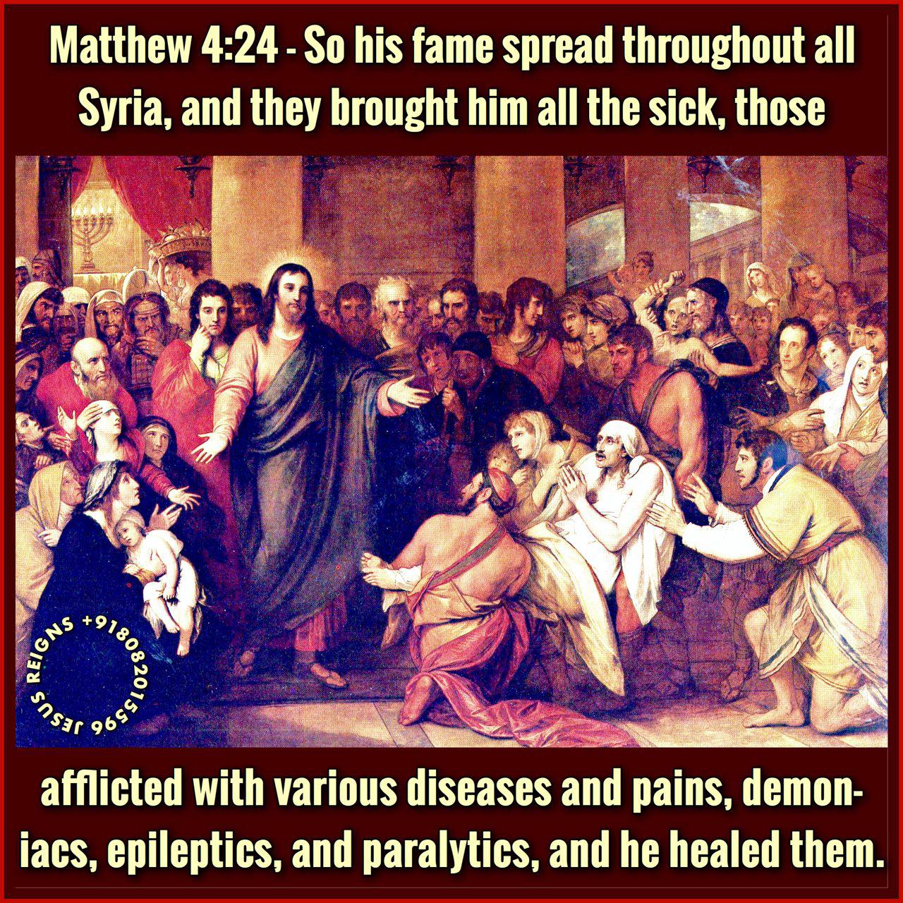 23 And he went about all Galilee, teaching in their synagogues and preaching the gospel of the kingdom and healing every disease and every infirmity among the people. 24 So his fame spread throughout all Syria, and they brought him all the sick, those afflicted with various diseases and pains, demoniacs, epileptics, and paralytics, and he healed them. 25 And great crowds followed him from Galilee and the Decapolis and Jerusalem and Judea and from beyond the Jordan.