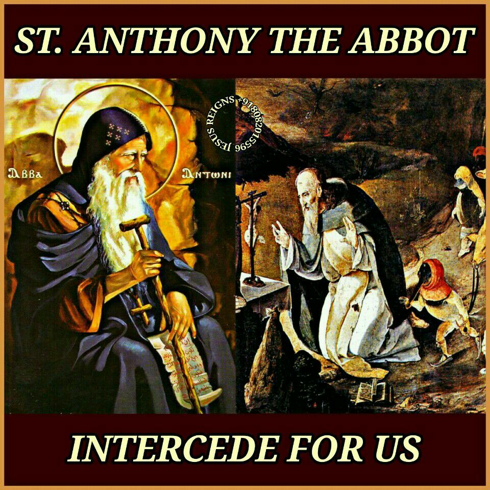 PRAYER: O God, who brought the Abbot Saint Anthony to serve you by a wondrous way of life in the desert, grant, through his intercession, that, denying ourselves, we may always love you above all things. Through our Lord Jesus Christ, your Son,who lives and reigns with you in the unity of the Holy Spirit, one God, for ever and ever. Amen.