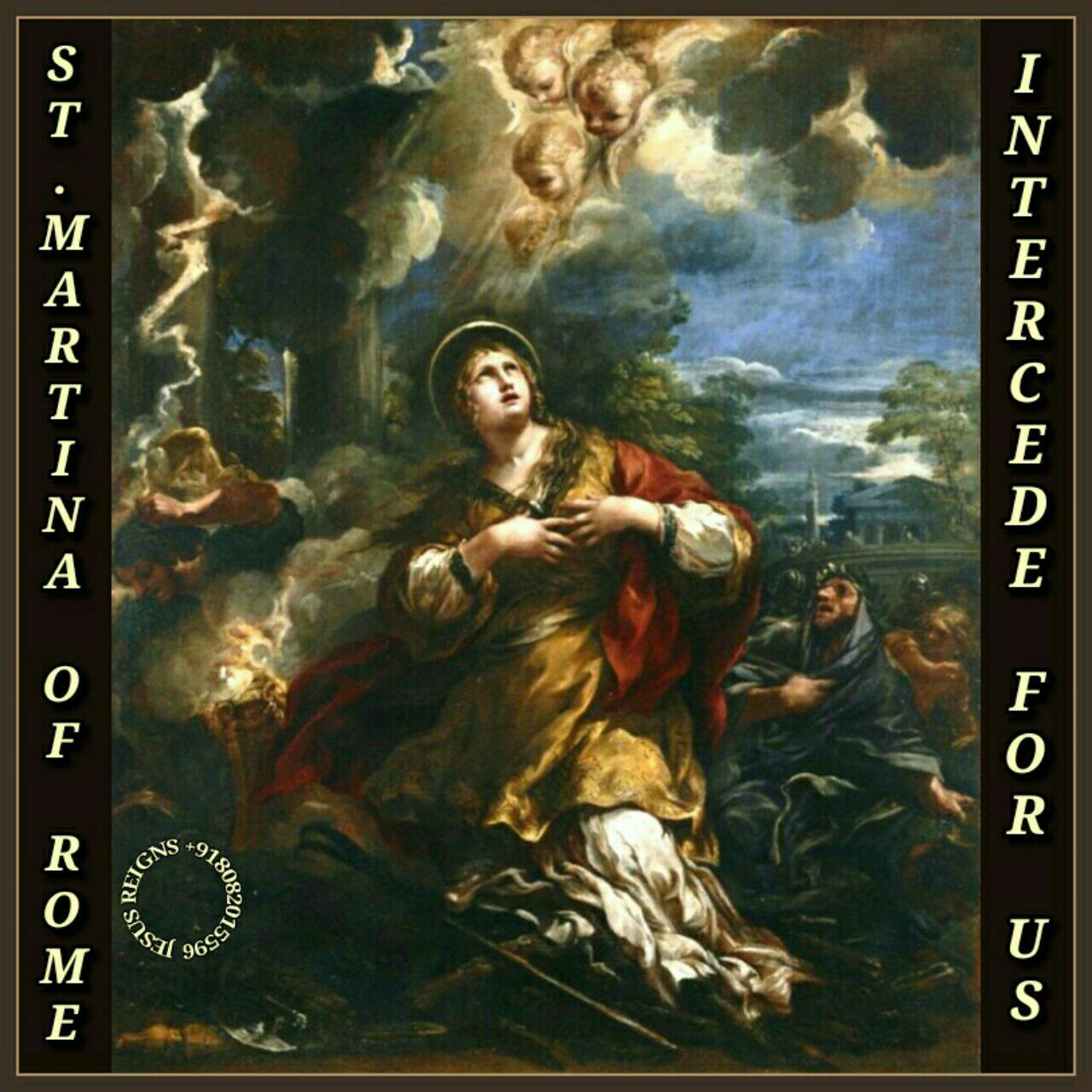 PRAYER: O St. Martina, princes of paradise, forever assured of the crown merited by your sufferings, have compassion on us, poor wanderers, sighing in this valley of tears, uncertain of our eternal destiny. obtain for us, we pray a great love of God, so that we also may one day praise and bless with you that infinite Good which you already possess, love, and behold face to face. Amen.