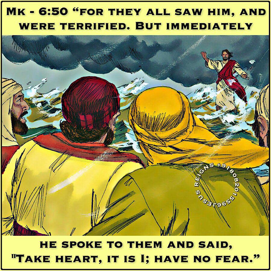 45 Immediately he made his disciples get into the boat and go before him to the other side, to Bethsaida, while he dismissed the crowd. 46 And after he had taken leave of them, he went up on the mountain to pray. 47 And when evening came, the boat was out on the sea, and he was alone on the land. 48 And he saw that they were making headway painfully, for the wind was against them. And about the fourth watch of the night he came to them, walking on the sea. He meant to pass by them, 49 but when they saw him walking on the sea they thought it was a ghost, and cried out; 50 for they all saw him, and were terrified. But immediately he spoke to them and said, "Take heart, it is I; have no fear." 51 And he got into the boat with them and the wind ceased. And they were utterly astounded, 52 for they did not understand about the loaves, but their hearts were hardened.
