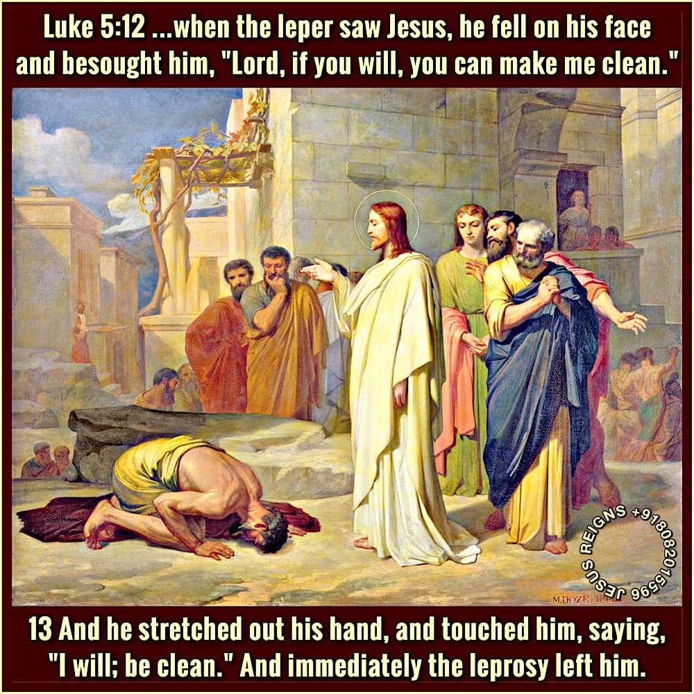 12 While he was in one of the cities, there came a man full of leprosy; and when he saw Jesus, he fell on his face and besought him, "Lord, if you will, you can make me clean." 13 And he stretched out his hand, and touched him, saying, "I will; be clean." And immediately the leprosy left him. 14 And he charged him to tell no one; but "go and show yourself to the priest, and make an offering for your cleansing, as Moses commanded, for a proof to the people." 15 But so much the more the report went abroad concerning him; and great multitudes gathered to hear and to be healed of their infirmities. 16 But he withdrew to the wilderness and prayed.