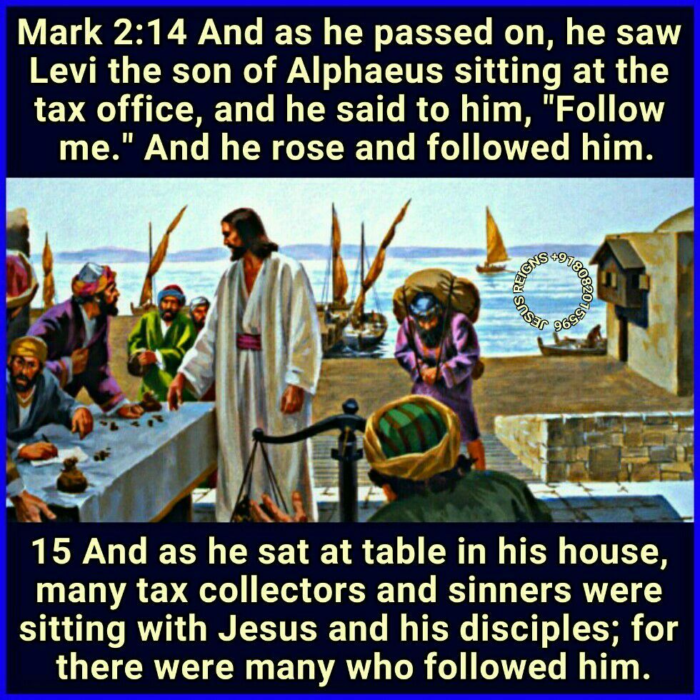 13 He went out again beside the sea; and all the crowd gathered about him, and he taught them. 14 And as he passed on, he saw Levi the son of Alphaeus sitting at the tax office, and he said to him, "Follow me." And he rose and followed him. 15 And as he sat at table in his house, many tax collectors and sinners were sitting with Jesus and his disciples; for there were many who followed him. 16 And the scribes of the Pharisees, when they saw that he was eating with sinners and tax collectors, said to his disciples, "Why does he eat with tax collectors and sinners?" 17 And when Jesus heard it, he said to them, "Those who are well have no need of a physician, but those who are sick; I came not to call the righteous, but sinners."
